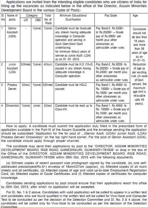Applications are invited from the intending eligible candidates who are citizens of India for filing up the vacancies as indicated below in the office of the Director, Assam Minorities Development Board in the various Cadre of Posts-