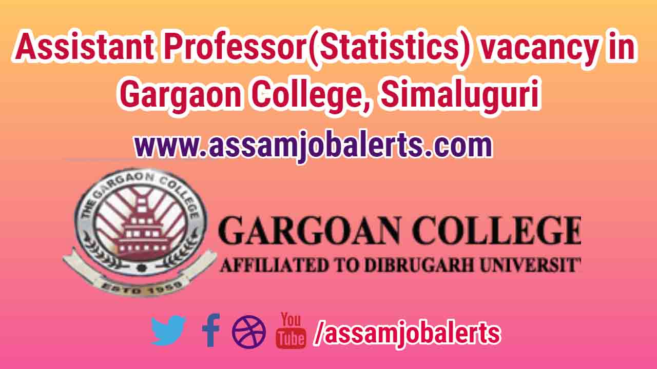 Assistant Professor(Statistics) vacancy in Gargaon College, Simaluguri: Applications are invited from the eligible candidates for the following post of Assistant Professor in prescribed Application Form available in college website www.gargaoncollege.org email and all testimonials from HSLC onwards, having proficiency in local language by a Bank Draft of Rs. 1,500/- (one thousand and five hundred only) of Principal, Gargaon College. Simaluguri payable at UBI, Simaluguri Branch. reach within 15 days from the date of publication of this advertisement. must send their application through proper channel with a No Objection authority.