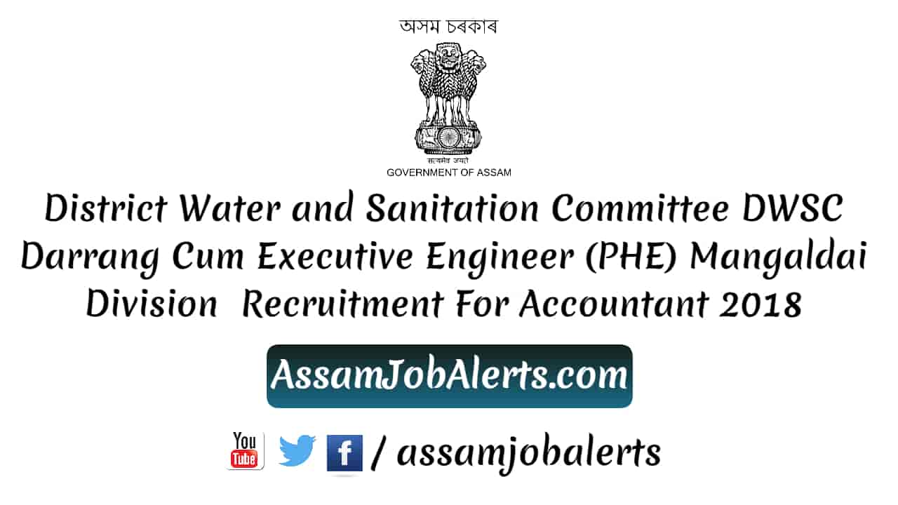 DWSC Darrang Cum Executive Engineer (PHE) Mangaldai Division Recruitment – District Water and Sanitation Committee (DWSC) invited application from candidates in plain paper with full Bio-data all from eligible local resident of Darrang District for 1 (One) post of Accountant on contractual basis for the year 2018-19 with a fixed remuneration This engagement is purely temporary Application will be received by the undersigned up to 26/03/2018.