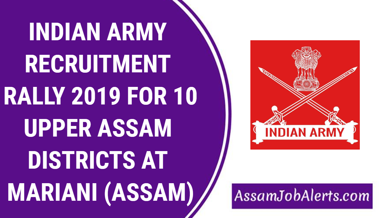 An Army Recruitment Rally will be held for eligible candidates of 10 x districts of Upper Assam (Jorhat, Majuli, Tinsukia, Dibrugarh, Golaghat, Sivasagar, Charaideo, Dhemaji, North Lakhimpur and Karbi Anglong) wef 02 Mar 2019 to 09 Mar 2019 at Mariani (Venue). Online registration is mandatory to appear in the rally which will be open from 20 Nov 2018 to 31 Dec 2018. The Admit Cards for the rally will be sent through registered e-mail from 03 Jan 2019 to 06 Jan 2019. Candidates should reach the venue on given date and time as mentioned in the Admit Card.