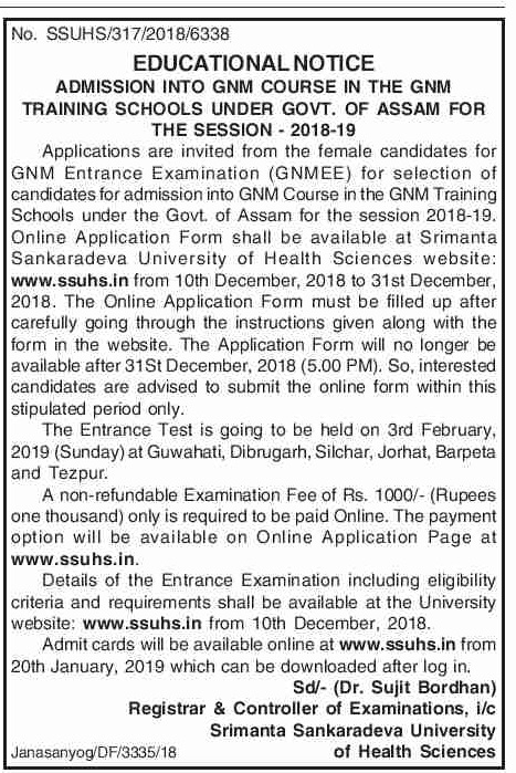 GNM Nurse Admission Notice under GNM Training School Assam For 2018-19 | Apply online at ssuhs.in