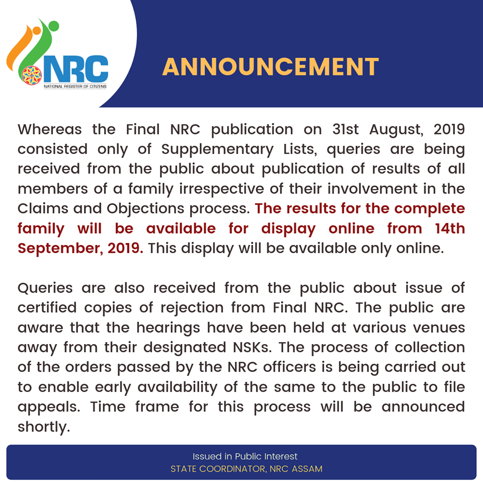 • FINAL NRC ASSAM COMPLETE FAMILY RESULT ONLINE CHECK FROM 14TH SEPTEMBER 2019 @ nrcassam.nic.in FINAL NRC ASSAM COMPLETE FAMILY RESULT ONLINE CHECK FROM 14TH SEPTEMBER 2019 @ nrcassam.nic.in