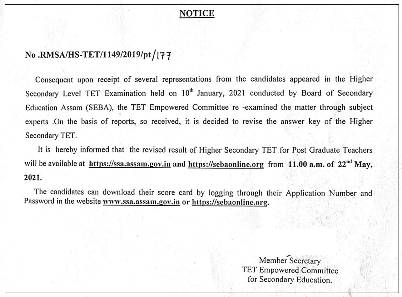 It is hereby informed that the revised result of Higher Secondary TET for Post Graduate Teachers will be available at https://ssa.assam.gov.in and sebaonline.org from 11.00 a.m. of 22nd May, 2021.