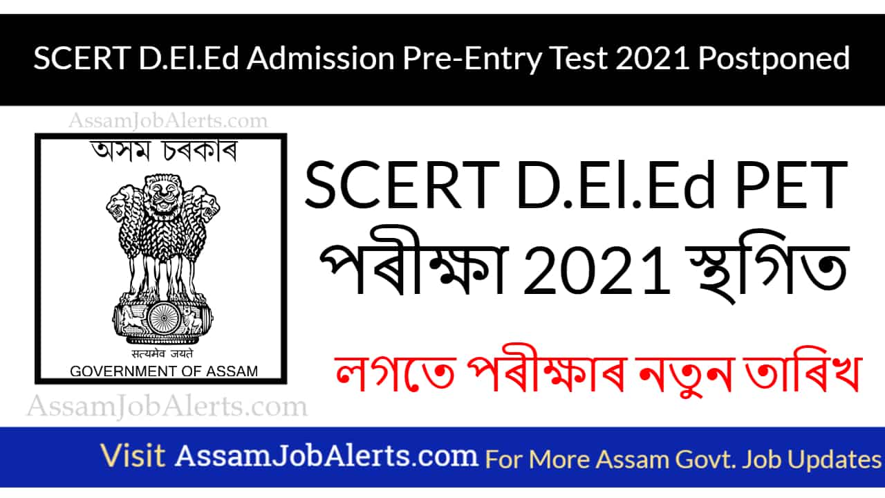 The State Council of Educational Research and Training (SCERT), Assam has released a notification regarding postponement of SCERT D.El.Ed PET Exam 2021. The SCERT D.El.Ed PET Exam 2021 was scheduled to be held on 27-06-2021. The online application for SCERT D.El.Ed Exam 2021 was held from 10th to 27th May 2021. The candidates who applied for the same are requested to check the official notification as it is given below.