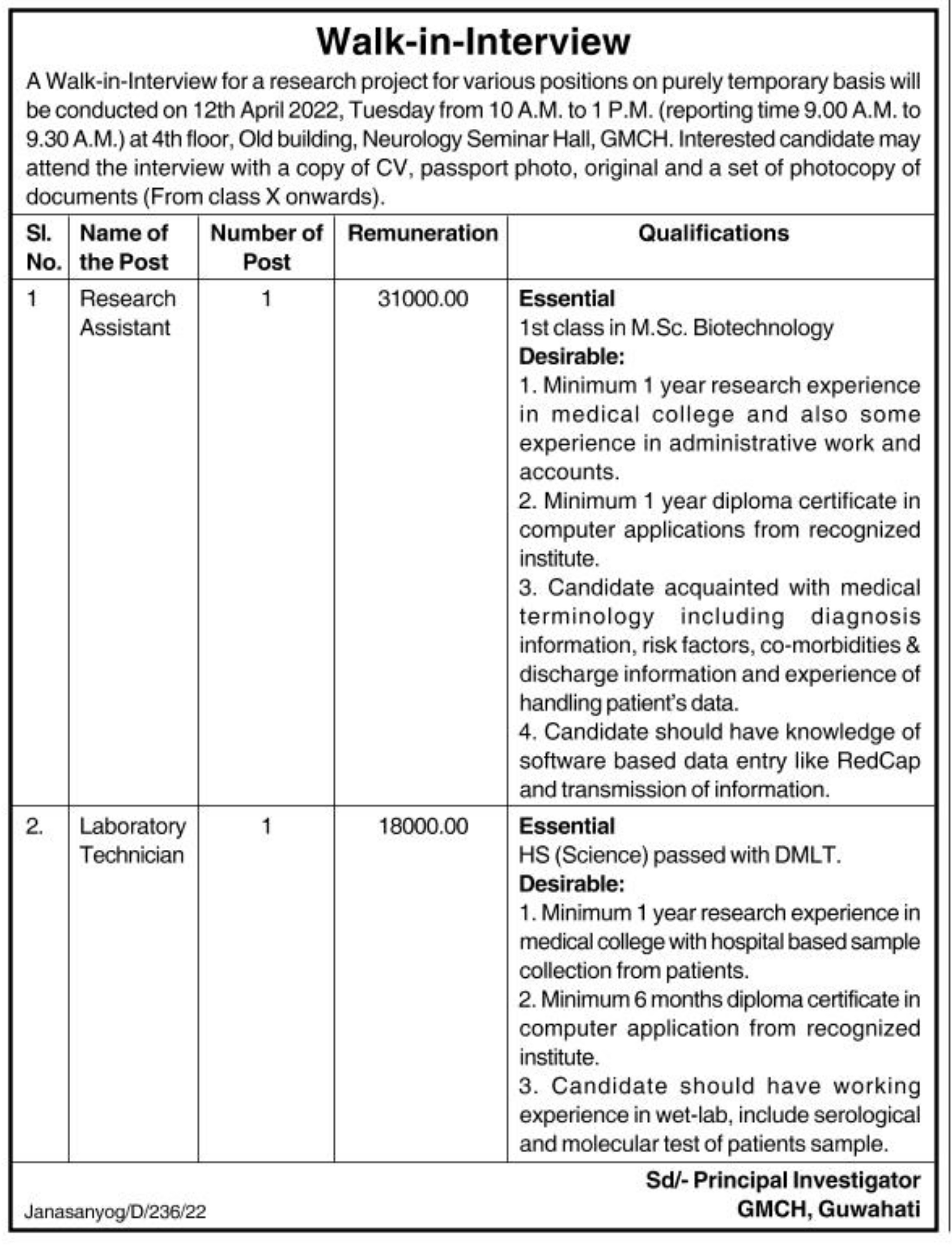 A Walk-in-Interview for a research project for various positions on purely temporary basis will be conducted on 12th April 2022, Tuesday from 10 A.M. to 1 P.M. (reporting time 9.00 A.M. to 9.30 A.M.) at 4th floor, Old building, Neurology Seminar Hall, GMCH. Interested candidate may attend the interview with a copy of CV, passport photo, original and a set of photocopy of documents (From class X onwards).