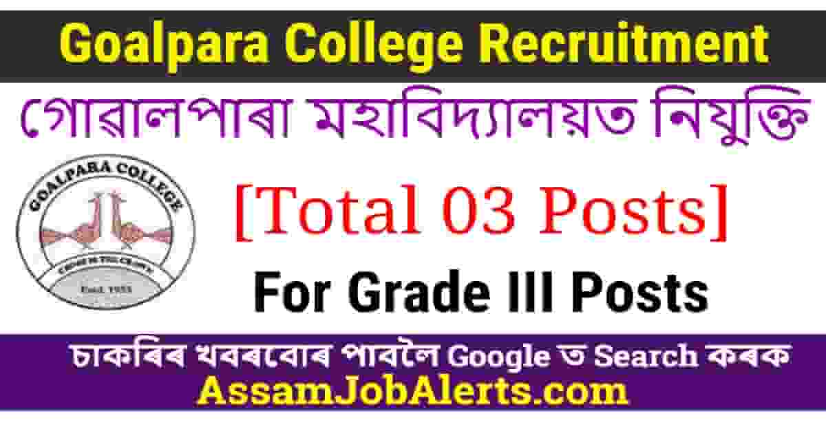 Goalpara College Recruitment 2022 : The Goalpara College, Goalpara has published a recruitment notification regarding recruitment of 03 Junior Assistant, Library Assistant and Laboratory Assistant Posts. Applications are invited in Assam Gazette (Part-IX) Standard Form with complete Biodata (with Mobile Number and Email id) for the vacant sanctioned Grade-III posts. For more Assam Job Notifications Please Visit Assam Job Alert Regularly.