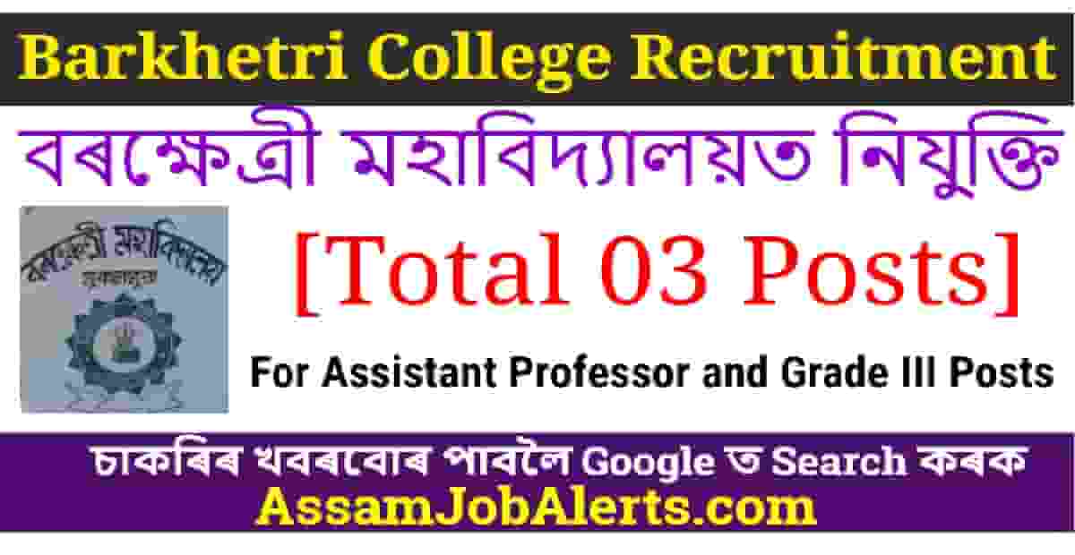 Barkhetri College Recruitment – Barkhetri College, Mukalmua has invited application from eligible candidates for the post of Assistant Professor in Chemistry, Botany departments and for Grade III Posts. Interested candidates have to fill up the applications in prescribed format available in DHE website along with all supporting documents are invited for the post of Assistant Professors in the following subjects as per latest UGC norms. For more Assam Job Notifications Please Visit Assam Job Alert Regularly.