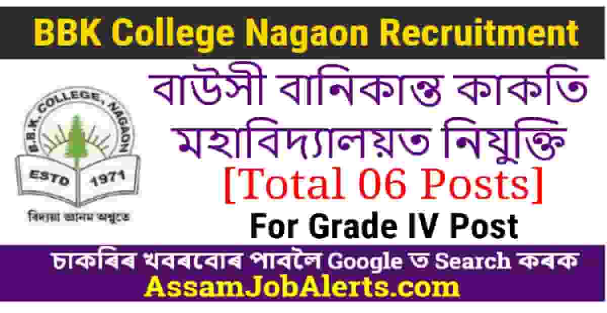 BKB College Recruitment 2022 : The BBK College, Nagaon also know as Baosi Banikanta Kakati College has published a recruitment notification regarding recruitment of 06 Grade IV Posts. Applications are invited along with self-attested copies of all the testimonials for recruitment of the vacant Posts of Grade IV. For more Assam Job Notifications Please Visit Assam Job Alert Regularly.