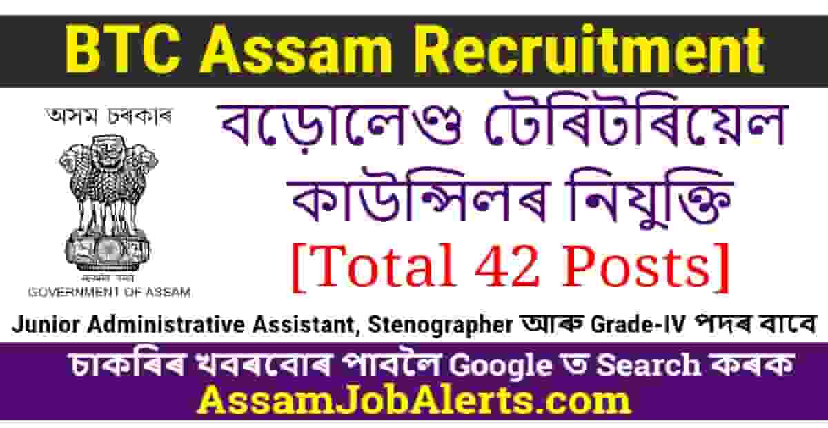 Bodoland Territorial Council(BTC) has published a recruitment notification regarding recruitment of 42 Junior Administrative Assistant, Stenographer and Grade-IV Posts at BTC Secretariat, BodofaNwgwr, Kokrajhar, BTC,Assam. Interested candidates may check the detail notification as given below. For more Job notifications please visit Assam Job regularly.