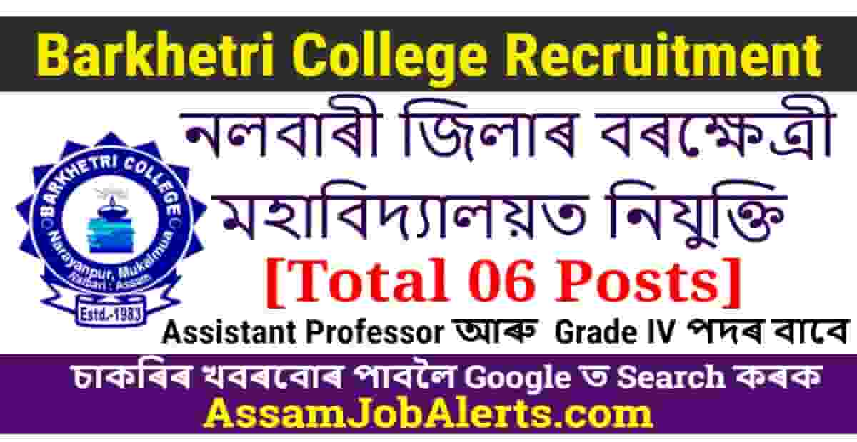 Barkhetri College, Narayanpur, Mukalmua has published a recruitment notification regarding recruitment of 06 Assistant Professor in various departments and Grade IV post. Interested candidates have to fill up the applications in prescribed format available in DHE website along with all supporting documents are invited for the post of Assistant Professors in the following subjects as per latest UGC norms. For more Job notifications please visit Assam Job Alert regularly.