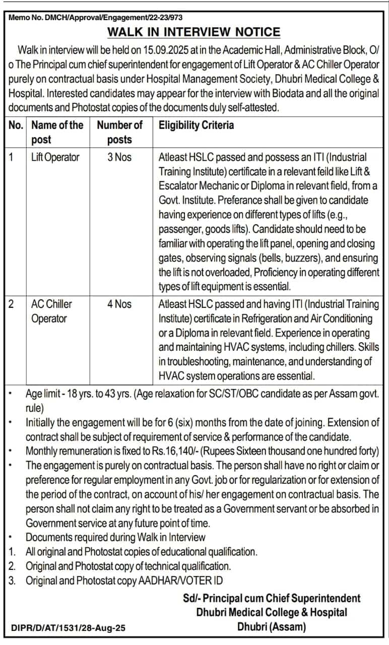 Dhubri Medical College and Hospital, Dhubri has published recruitment notifications regarding recruitment of 07 Lift Operator and AC Chiller Operator Posts. Interested candidates may check the detail notification as given below. For more Assam Job Notifications Please Visit Assam Job Alert Regularly.