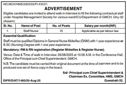 Interested and Eligible Eligible candidates are invited to attend walk in interview to fill the following contractual staff under Hospital Management Society for various ward/ICU/Department of GMCH, Ghy-32 (Assam).