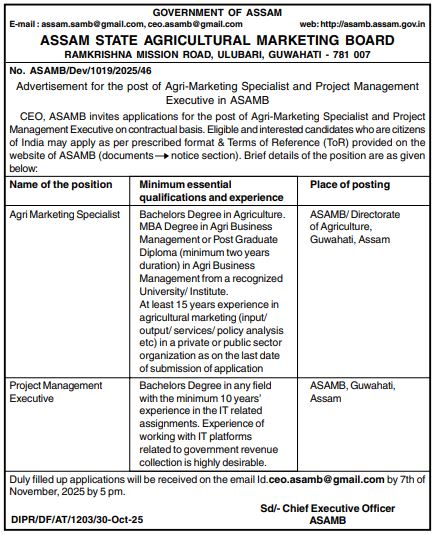 Interested and eligible candidates need to apply through duly filled up applications will be received on the email Id.ceo.asamb@gmail.com by 7th of November, 2025 by 5 pm.