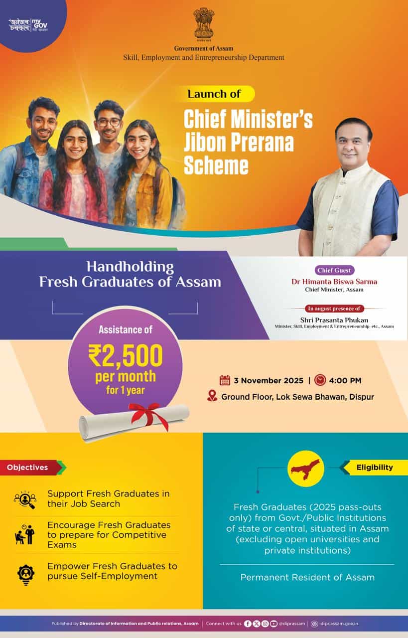 To empower the youth of Assam and to support graduates as they transit from education to employment Assam Chief Minister has introduced the Jibon Prerana Scheme. The scheme provides a financial assistance to provide them with stability and encouragement during their job-search period. This initiative is not an unemployment allowance, but a motivational support (Prerana) to help them prepare for competitive exams, interviews, and entrepreneurial pursuits.